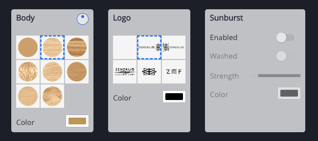 Here you can select which Zendrum logo (or none) to display on the body. You can also choose the color (usually black or gold).