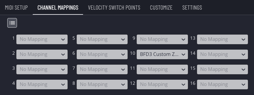 The channel mappings preference pane displays a grid of 16 dropdown controls, one for each MIDI® channel. Use these to select which mapping to use for each channel.
