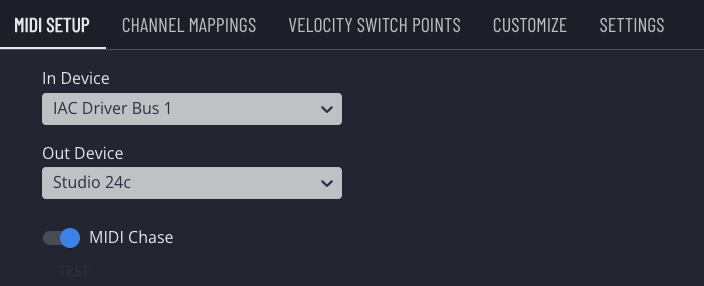 When enabled, the MIDI chase function causes the application to automatically select trigger(s) based on incoming MIDI messages (based on channel, status and note number).