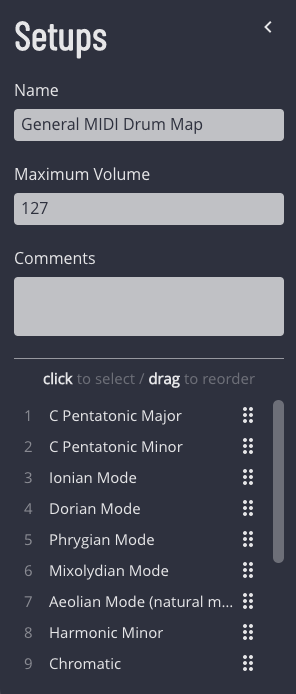 To edit a particular Setup, first open the Setups drawer by clicking on the current setup name on the top-left side of the screen, or from the menu Setups -> Toggle Editor